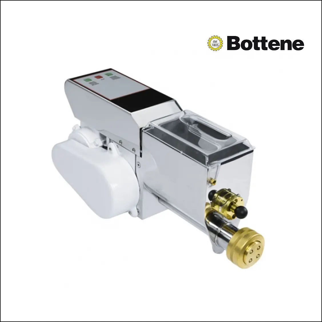 Pasta machine LILLODUE, the smallest version of pasta machine from Bottene that allows you to produce fresh pasta using any type of flour, with or without eggs, and even enhanced with tomato puree for red pasta, spinach for green pasta and brown pasta from cocoa. The package includes 4 bronze dies for spaghetti, macaroni, fettuccine and pasta sheet