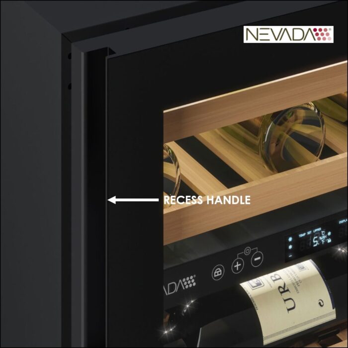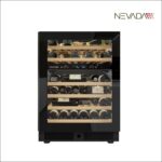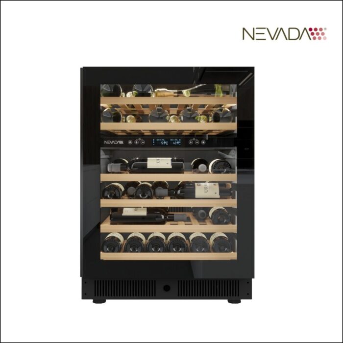 46 Bottle Wine Cellar, Independent Dual Temperature, Full Glass Black Door Finish with Recess handle. Premium Interior Setup with 6 Sliding Shelves, Dual Emission 3-Color LED Light, Soft Touch Control, LCD Display.
