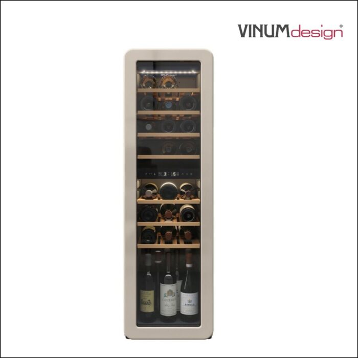 Double Temperature Wine Cellar, painted in Cream White RAL 9002 – PANTONE 7534C Without Handle. Premium Interior Setup with 7 Internal Shelves, Horizontal Double Emission White LED Light, Soft Touch Control, LED Display. | Optional equipment available – GS3 Beverage Kit for NVD120-30D models